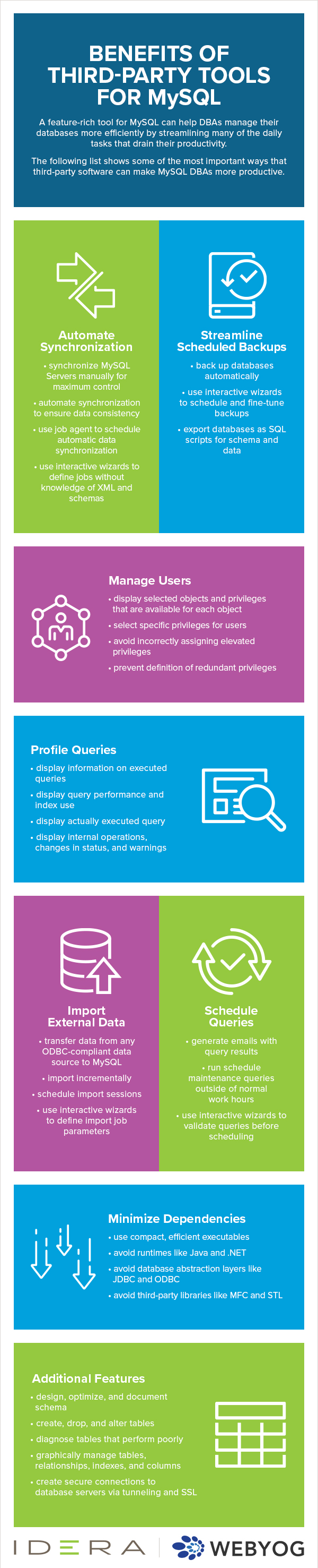 The following list shows some of the most important ways that third-party software can make MySQL DBAs more productive.