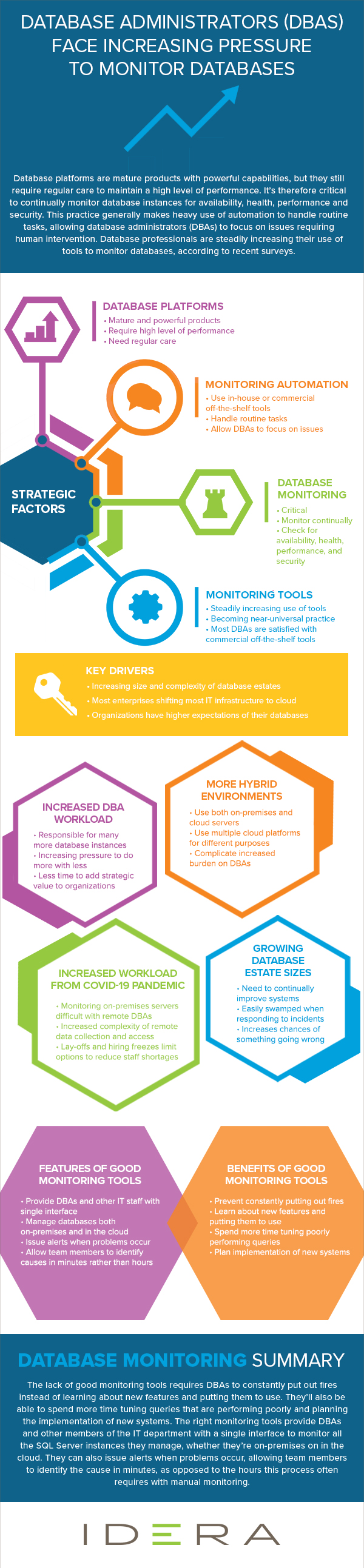 Database platforms are mature products with powerful capabilities, but they still require regular care to maintain a high level of performance. It’s therefore critical to continually monitor database instances for availability, health, performance, and security. This practice generally makes heavy use of automation to handle routine tasks, allowing database administrators (DBAs) to focus on issues requiring human intervention. Database professionals are steadily increasing their use of tools to monitor databases, according to recent surveys.